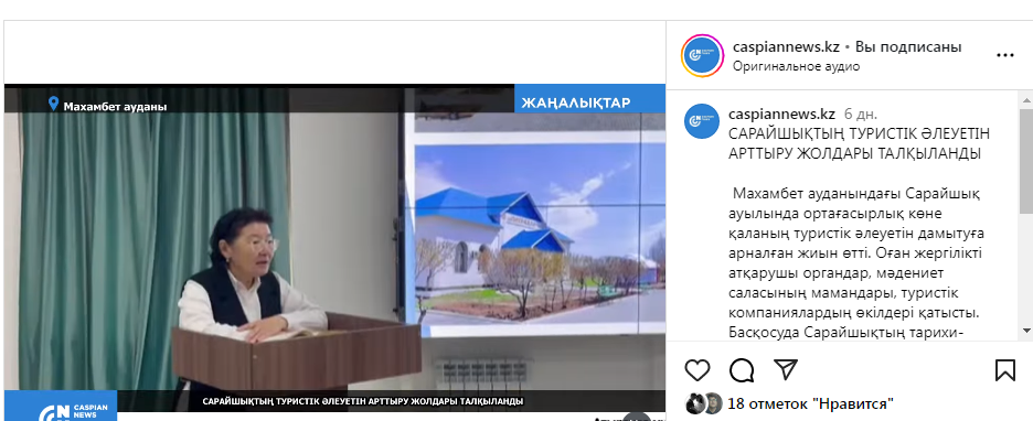 В музее-заповеднике «Сарайшық» состоялся круглый стол на тему «Пути повышения туристического потенциала Сарайшыка» с участием представителей туристической сферы Атырауской области. Об этом было опубликовано на странице Caspian News в Instagram.