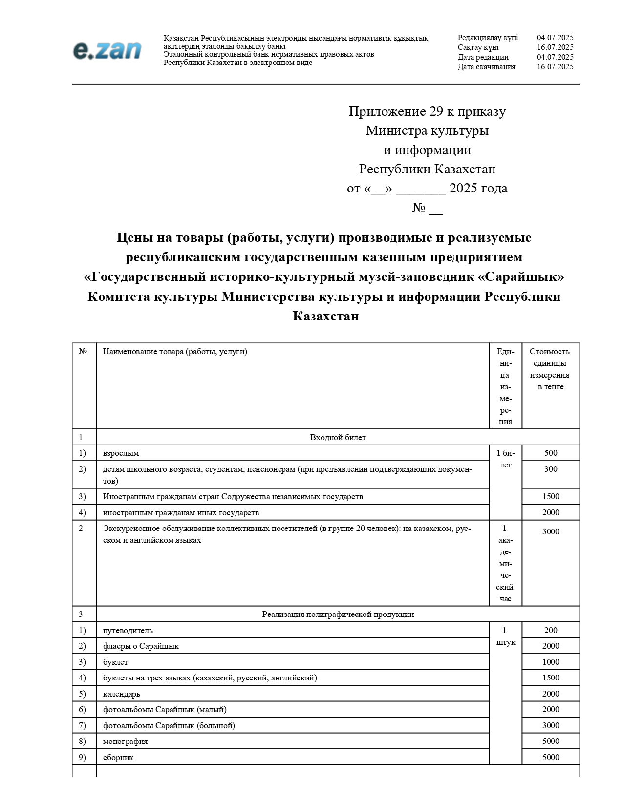 Цены на товары (работы, услуги), производимые и реализуемые республиканским государственным казенным предприятием "Государственный историко-культурный музей-заповедник "Сарайшық"
