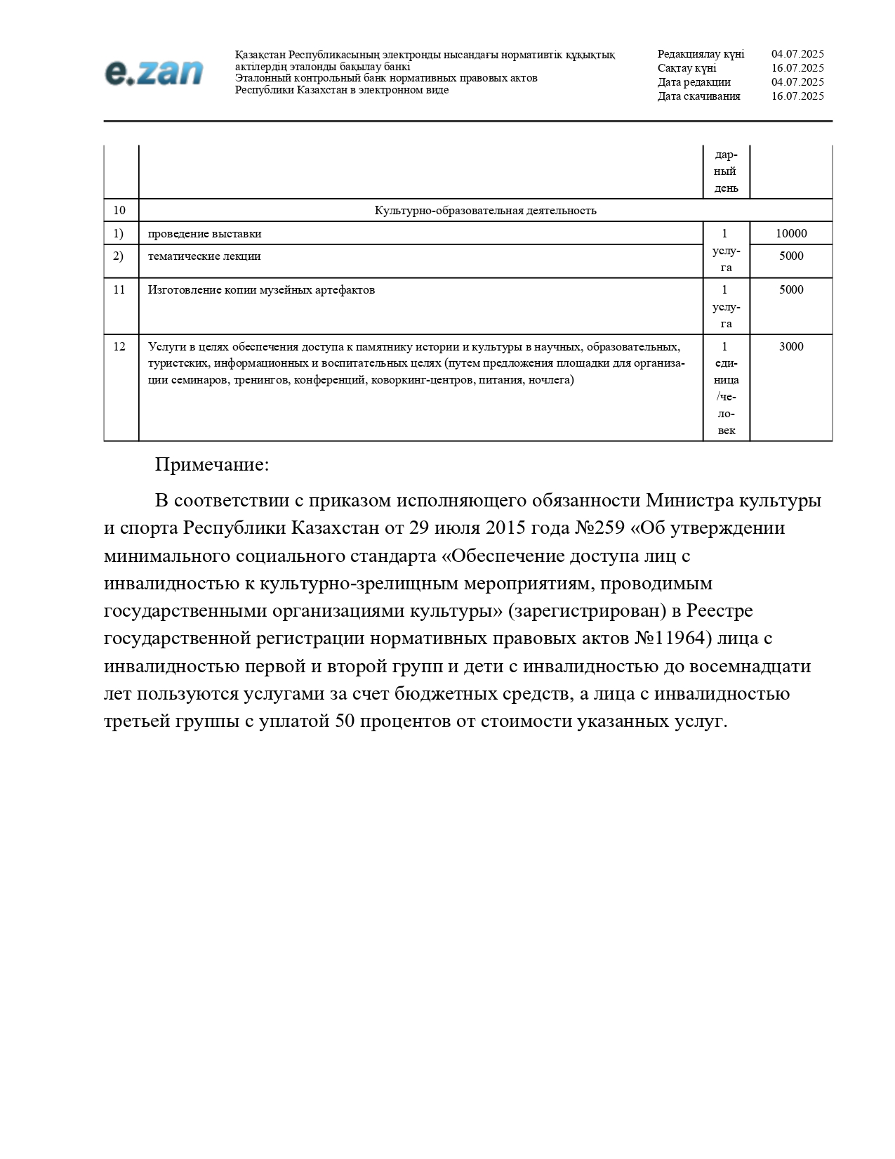 В соответствии с приказом исполняющего обязанности министра культуры и спорта Республики Казахстан от 29 июля 2015 года № 259 «Об утверждении минимального социального стандарта» обеспечение доступа инвалидов к культурно-зрелищным мероприятиям, проводимым государственными организациями культуры» (зарегистрирован в Реестре государственной регистрации нормативных правовых актов за № 11964) инвалиды первой и второй групп и дети-инвалиды до восемнадцати лет пользуются услугами за счет бюджетных средств, а инвалиды третьей группы – 50 процентов от оказываемых услуг.