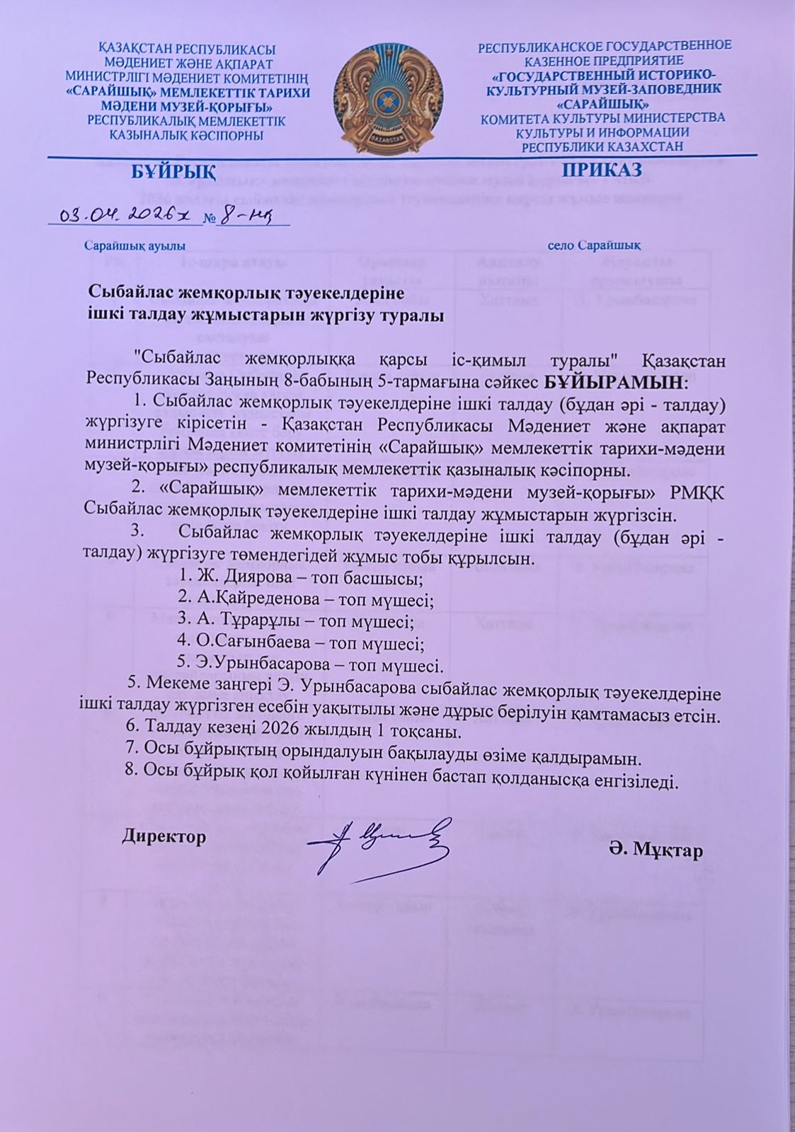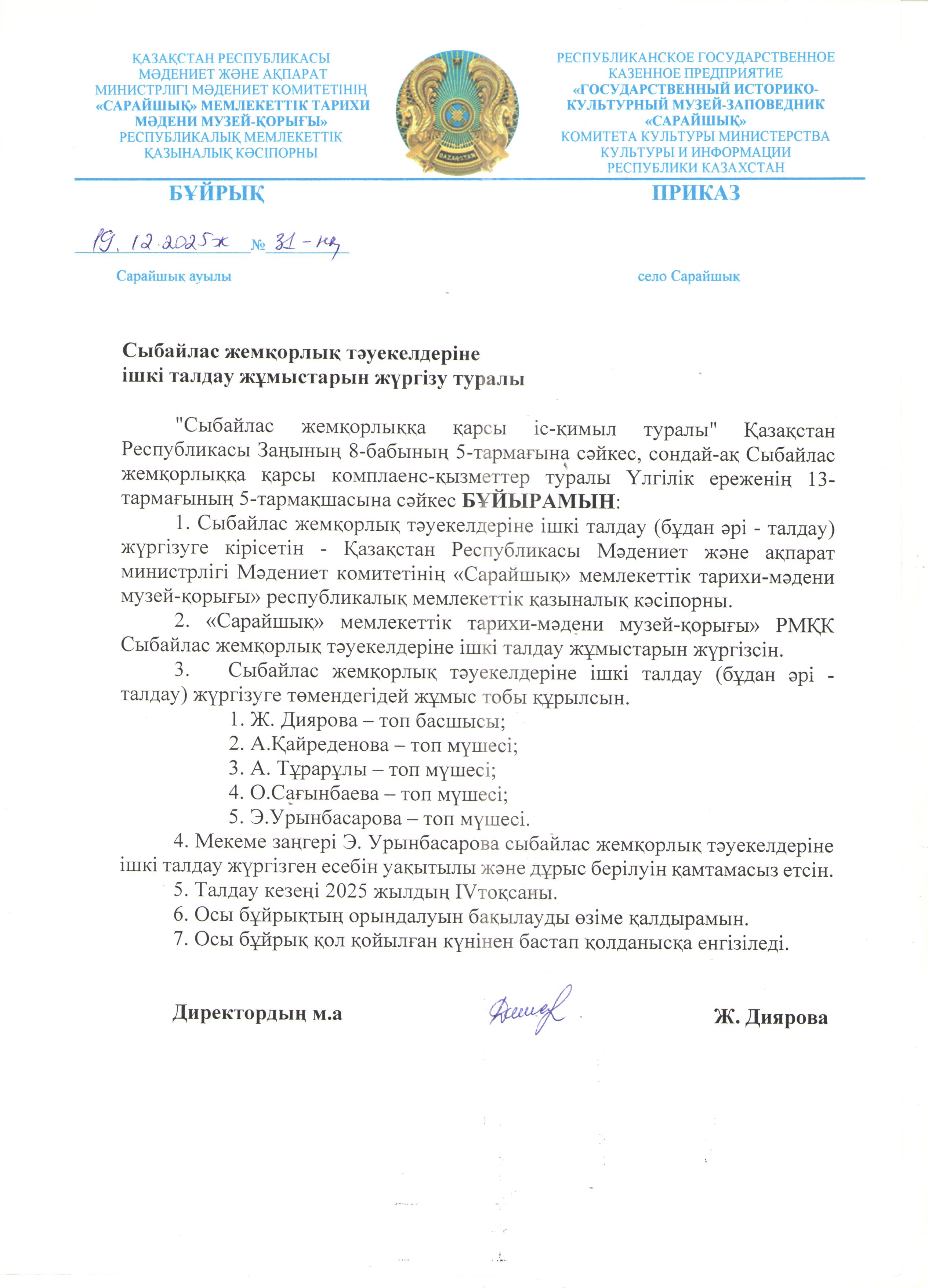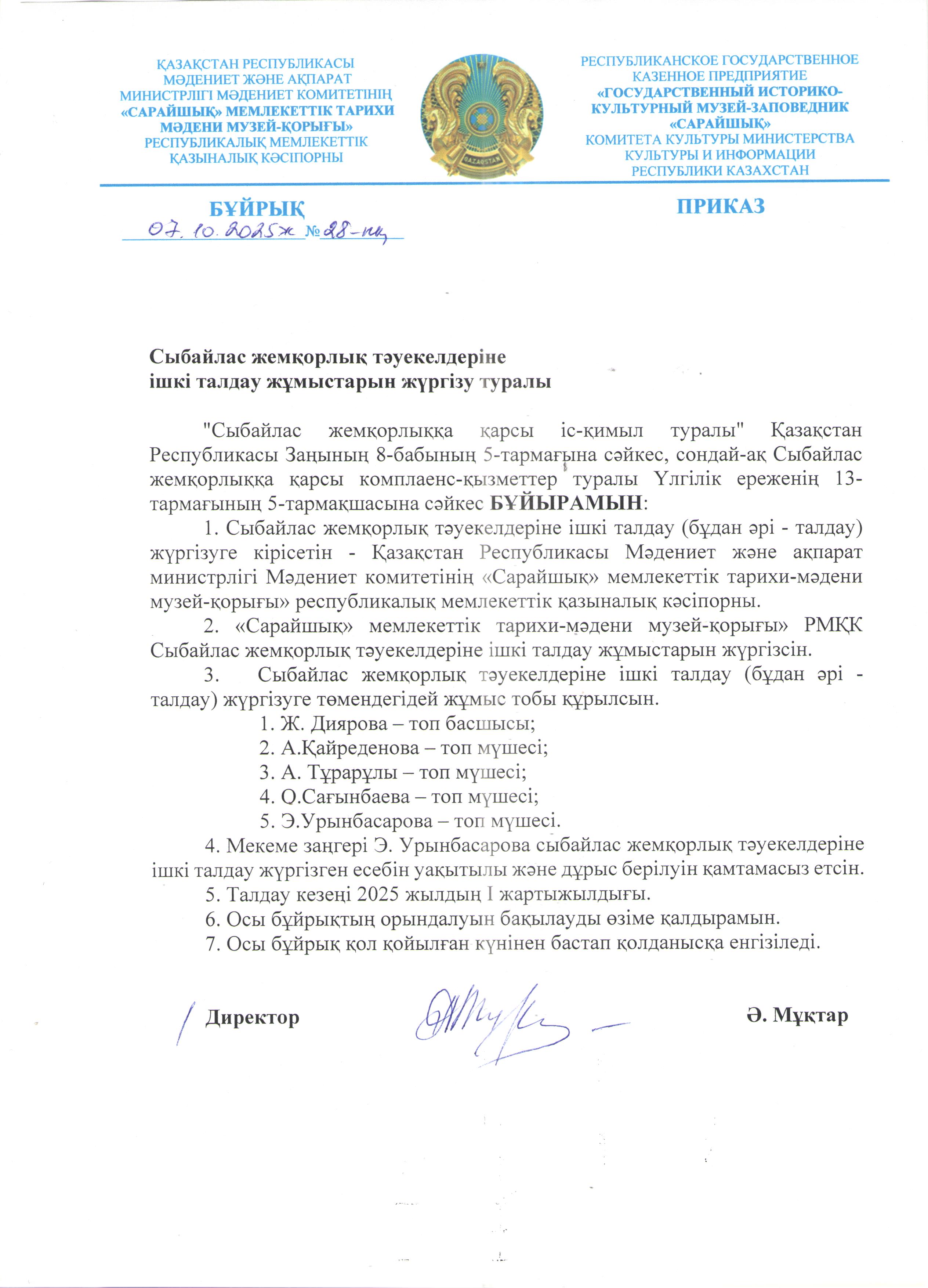 2025 жылдың Сыбайлас жемқорлық тәуекелдеріне қарсы ішкі талдау жұмыстарының бұйрығы