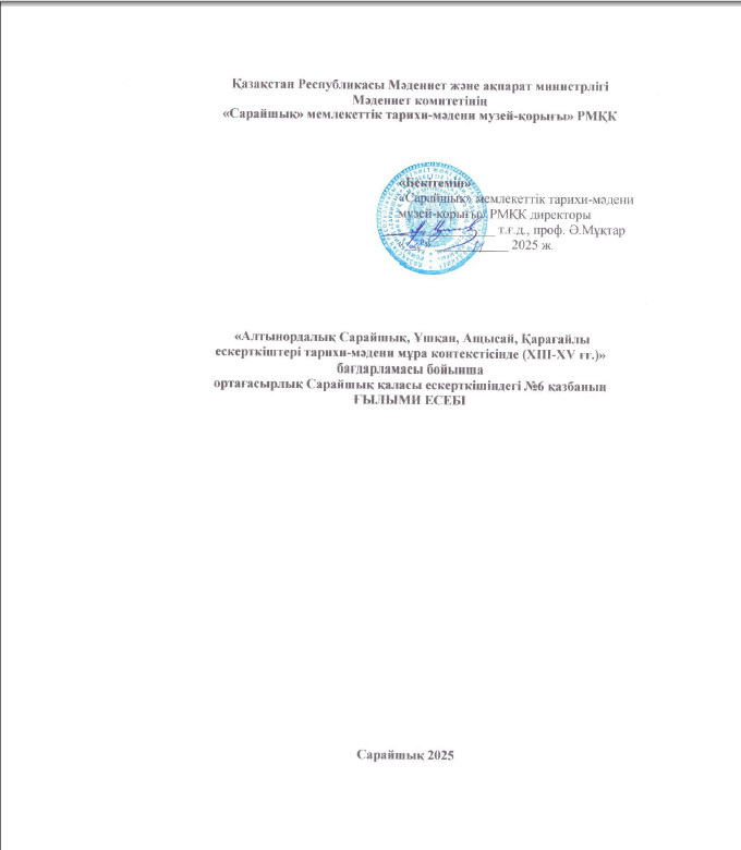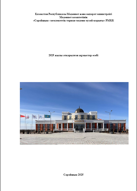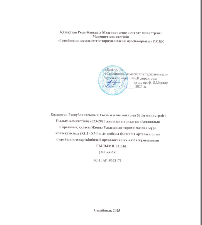| Қазақстан Республикасының Ғылым және жоғарғы білім министрлігі Ғылым комитетінің 2023-2025 жылдарға арналған «Астаналық Сарайшық қаласы Жошы Ұлысының тарихи- мәдени мұра контекстісінде (ХІІІ - ХVІ ғғ.)» жобасы бойынша ортағасырлық Сарайшық ескерткішіндегі археологиялық қазба жұмысының 2025 жылғы Ғылыми есебі (толық нұсқасы музей-қорықта сақталған) |
